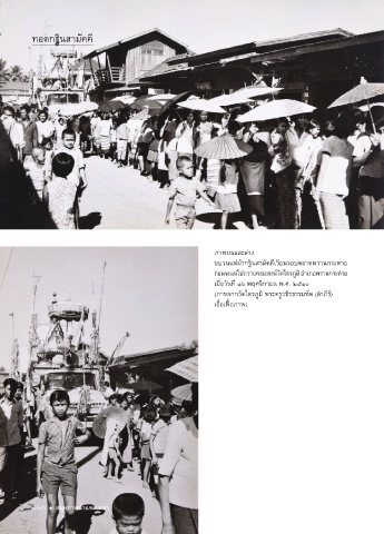 ทอดกฐินส�มัคคี ภำพบนและล่ำง ขบวนแห่ผ้�กฐินส�มัคคีเวียนรอบตล�ดพร�นกระต่�ย ก่อนจะแห่ไปถว�ยคณะสงฆ์วัดไตรภูมิ อำ�เภอพร�นกระต่�ย เมื่อวันที่ ๑๖ พฤศจิก�ยน พ.ศ. ๒๕๑๐ (ภ�พจ�กวัดไตรภูมิ พระครูวชิรธรรมทัต (ลำ�ภีร์) เอื้อเฟื้อภ�พ) 126 สมุดภาพกำาแพงเพชร